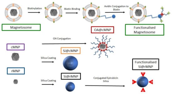 A schematic of the experimental design and samples produced in the study. Top labelled in green depicts the magnetosome and how it is biotinylated for functionalization. Centre left shows the control cMNP labelled in purple with surface coatings of oleic acid (red) and silica (orange label). Bottom left shows smaller control rMNP (blue label) coated with silica (black label) and with conjugated epirubincin (bottom right). Sample color-code used throughout in figures.
