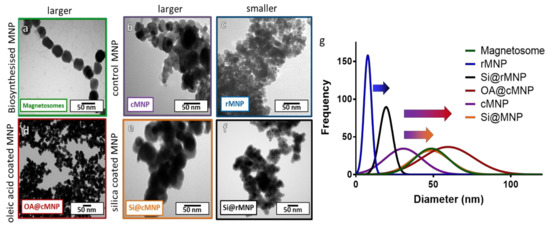 TEM images of magnetosomes and synthesized (un)coated MNP with size distribution. (a) Chains of magnetosomes, (b) cMNP, (c) rMNP, (d) OA@cMNP, (e) Si@cMNP, (f) Si@rMNP, (g) frequency distribution of magnetosomes and MNP sizes (curves show fitting curves of original histograms presented in the Supplementary Figure S1).