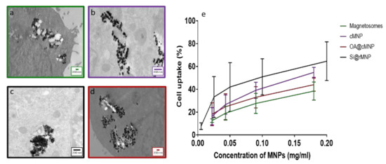 Figure 5a–d shows TEM images of MDA-MB-231 cells after uptake of magnetosomes, cMNP, Si@rMNP, and OA@cMNP, respectively and all show the MNP were readily taken up within the cell through inclusion bodies and were located intracellularly. Due to the size of the particles, intracellular uptake is most likely via pinocytosis with the inclusion bodies being pinosomes or lysosomes [51]. Although other processes have been proposed for MNP internalization including clathrin mediated endocytosis, caveolin mediated endocytosis and direct penetration of the membrane [52,53]. Although still present in some of the intracellular vesicles, a large proportion of particles are seen to have migrated to the extracellular matrix. The majority of the magnetosomes were presumed to be still organized in chains, which may help them to be less prone to uncontrolled aggregation. Indeed, several chains of magnetosomes appear inside the cell (Figure 5a). When magnetosomes are distributed in a small stable chain, they are less likely to aggregate than other MNP [54].
