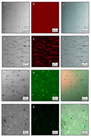 Biotin streptavidin binding is a fast and specific method to functionalize NPs. Biotinylation is an ideal conjugation method for use with magnetosomes due to its specificity and ability to form covalent bonds between the biotin molecule and proteins on the surface of the magnetosome. There are two methods of biotinylation: Chemical and enzymatic. Here we used the chemical method owing to its simplicity. Chemical biotinylation was performed by modifying the surface amino acids of the magnetosome with biotin N-hydroxysuccinimide (NHS). This was used to bind a green or red fluorescence Alexa Fluor®488 or Alexa Fluor® 594 streptavidin to magnetosomes. The functionalized magnetosomes were imaged using fluorescent microscopy to determine if the Alexa Fluor® 594 and 488 dye was bound to the magnetosomes surface (Figure 7a–i). From microscopy, the streptavidin Alexa Fluor® 594 dye is seen to only bind to the magnetosomes after biotinylation (Figure 7a–f) as unbiotinylated magnetsomes have little to no fluorescence after treatment with the dye (Figure 7a–c). When biotinylated, the 594 and 488 dye is localized on the magnetosomes after washing (Figure 7c,f), showing conjugation to the magnetosome membrane. Incubation of MDA-MB-231 cells with the conjugate were imaged after 24-h (Figure 7j–l) and showed uptake of the magnetosomes into cells (Figure 7j) as well as fluorescence of the magnetosomes from the conjugated Alexa Fluor®488. The transport and internalization of these biotin functionalised magnetosomes was observed inside the cells (Figure 7l). The magnetosomes can be seen within the cytoplasm of the cell as well as a portion being closely associated with the nuclear membrane.