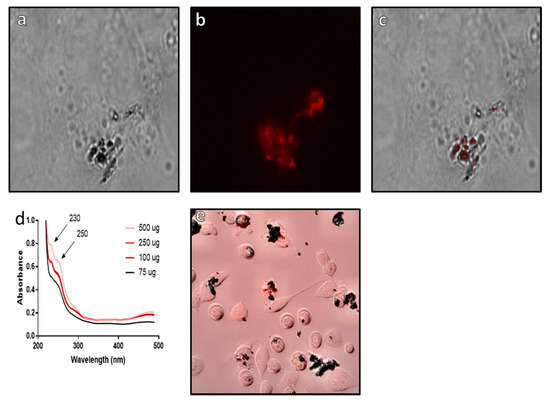Analysis of epirubicin binding to Si@rMNP. Epirubicin conjugated Si@rMNP under brightfield microscopy (a) and fluorescent microscopy (b) (images were taken at ×50 magnification), (c) a composite image of both bright field and fluorescent channels showing localization of epirubicin to the Si@rMNP, (d) UV-vis of Si@rMNP after binding to epirubicin at varying concentrations, (e) composite bright field and fluorescent microscopy of epirubicin Si@rMNP uptake with MDA-MB-231 cells.