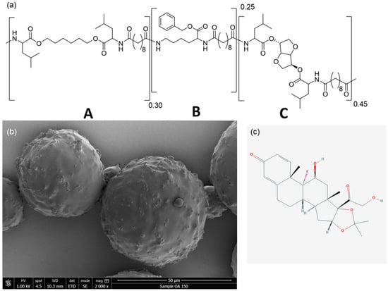 (a) Structure of polyesteramide (PEA) III Ac Bz random copolymer consisting of building blocks A, B and C (Leu, Lys, Leu). (b) Scanning electron microscopy (SEM) image of triamcinolone acetonide (TA) loaded microspheres. (c) 2D molecular formula of triamcinolone acetonide (TA) (https://pubchem.ncbi.nlm.nih.gov/image/imgsrv.fcgi?cid=6436&t=l, accessed date 31 January 2021).