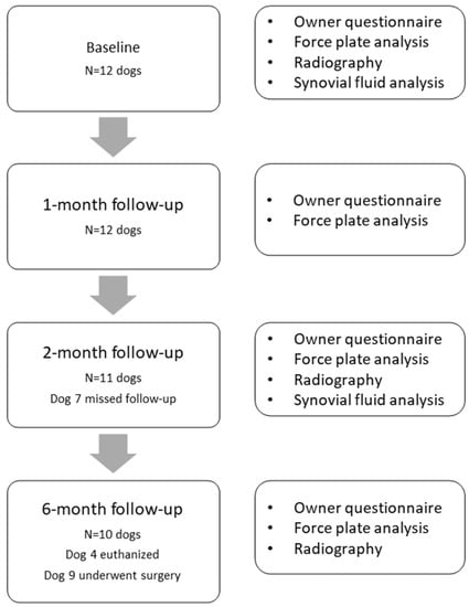 This study was conducted with the approval of the Ethical Committee of the Department of Clinical Sciences, Utrecht University (#17-06). Owners were informed orally and in writing, and written consent was obtained before study enrolment. The study design is illustrated in Figure 2. Dogs were considered eligible for the study if they were otherwise healthy, weighed at least 15 kg, had a history of chronic lameness (lasting more than four weeks) attributable to a specific joint and were diagnosed with pain and OA of that particular joint on orthopaedic examination and radiographic evaluation. Dogs were excluded if they were gravid, had undergone surgery in the affected or contralateral limb in the preceding three months, if there was evidence of a fracture or neoplasia in the affected limb, or if the dog had received IA injections in the affected joint in the preceding three months. Dogs with joint instability on physical examination were also excluded from the study. Pain medication was discontinued four days prior to the start of the study, to obtain baseline levels of the read-out parameters and four days prior to each control visit to minimize the effect on read-out parameters.