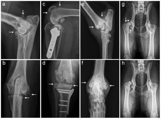 Orthogonal radiographs of the affected joints were obtained within one month prior to inclusion in the study and at two and six months after injection to monitor for adverse effects and OA progression. Images were examined blinded, in one session, by a board-certified veterinary radiologist (MB). Each radiograph was scored for OA severity as follows: 0 (none); 1 (mild), 2 (moderate) or 3 (severe) [48]. To assess OA more quantitatively, the size of osteophytes was measured and graded as described previously for the elbow joint: 0 (no OA), 1 (osteophytes < 2 mm), 2 (osteophytes 2–5 mm) or 3 (>5 mm) [49]. Osteophytes in cubital joints were measured at the cranial aspect of the radial head, the caudal surface of the lateral condylar ridge, the medial contour of the humeral condyle and the medial contour of the medial coronoid process. For coxofemoral joints, osteophytes on the edge of the cranial and caudal acetabulum or at the femoral neck were considered. For femorotibial joints, osteophytes were measured at the proximal trochlear edge, the distal patella and the lateral and medial tibia plateau. Osteophytes in the tarsal joint were measured at the medial and lateral aspect of the distal tibia (Figure 3a–h). The highest value for each joint was considered in the analysis.