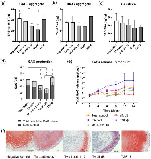 Biochemical and histological analysis of aggregates exposed to continuous or intermittent TA. (a) Total GAG per aggregate was significantly lower in the condition that received TA on day 1 and 8 compared to the negative control of the 14-day experiment. (b) DNA per aggregate and (c) GAG/DNA did not differ between culture conditions after the 14-day culture experiment. (d) Total GAG production and GAG release and (e) GAG release in the culture medium showed a similar pattern, in which total GAG production and release were significantly lower in the conditions that received TA intermittently (TA d1–3, d11–13 and TA d1,d8) compared to the other conditions. (f) Safranin-O/Fast Green staining of representative aggregate paraffin sections. * indicates significant difference (p < 0.05).