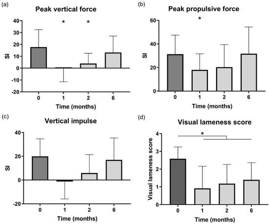Results of force plate analysis before and 1, 2 and 6 months after intra-articular injection with triamcinolone acetonide-loaded microspheres. (a) The symmetry index (SI) of the peak vertical force (a) was improved at one and two months post injection (p = 0.04, p = 0.027) compared to baseline. (b) The peak propulsive force was improved at the one-month follow-up (p = 0.041). (c) There was a borderline significant decrease in vertical impulse SI at one and two months post treatment (p = 0.053, p = 0.062). (d) The visual lameness score was significantly lower compared to baseline during the entire study period. * Indicates significantly different from baseline (p < 0.05).