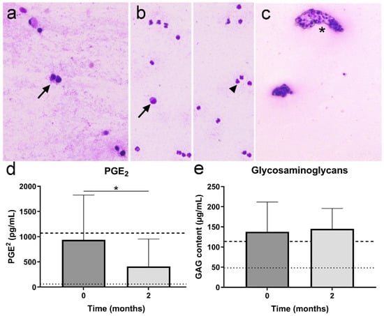 Results of the synovial fluid (SF) analysis prior to (T = 0) and at two-month follow up upon intra-articular injection with triamcinolone acetonide-loaded microspheres. (a) Synovial aspirate of dog five, six months after treatment. A few synoviocyte-like cells are present (arrow). (b) Cytological smear of SF of dog 3, six months after treatment. Abundant polymorphonuclear cells are present (arrowhead), along with some macrophage-like cells (arrow). No (intra)cellular bacteria were found. (c) Contact smear of the SF of dog 1 prior to treatment. Clusters of synovial lining cells are present (asterisk). Concentrations of (d) prostaglandin E2 (PGE2), (e) glycosaminoglycans (GAGs) in SF before and two months after intra-articular injection with triamcinolone-acetonide-loaded microspheres. Dotted lines indicate SF control samples of six healthy joints, dashed lines indicate average SF biomarker values for osteoarthritic joints of 6 donors. * Indicates significant difference (p < 0.05).