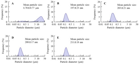 Particle size frequencies of PZI in CA-INS (A), nPZI (B), nPZI/PL (C), nPZI/PM (D), and nPZI/PH (E). The compositions of the INS ophthalmic formulations are shown in Table 1. The particle size of PZI was decreased by the bead mill, and the particle size frequencies in nPZI and nPZI/P were approximately 80–550 nm.