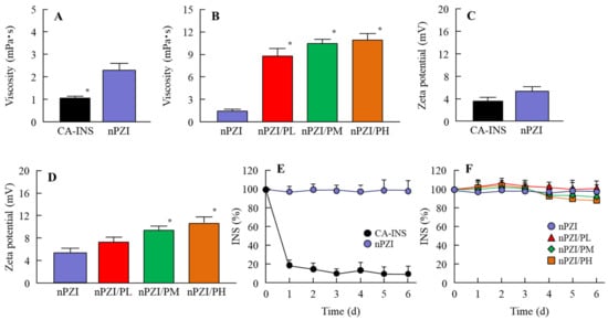 It would be useful if ophthalmic formulations could enhance the therapeutic efficacy of INS delivered by an ocular DDS []. However, the ocular instillation of traditional INS results in low BA [,] and short duration [] due to extensive drug loss at the ocular surface. Therefore, it is necessary to improve the absorption and increase the INS contact time at the absorption site. There have been several studies in which the use of a gel system has been reported to improve ocular BA and prolong the precorneal resident time of INS. Yamamoto et al. [] reported that BA via the ocular route of an INS solution containing 1% NaGC, which is an absorption enhancer, was approximately 1%. However, the addition of PAA enhanced the BA to greater than 5% for an INS solution comprising 1% NaGC and 0.1% PAA. In particular, PAA is more effective in increasing the ocular BA of INS in comparison with other gel bases such as Na-glycocholate, hyaluronic acid, or polyvinylalcohol []. In addition, we previously reported that the corneal and conjunctival accumulation of an ocular drug can be enhanced by adjusting the particle size of the drug to a range of 140–150 nm []. Although INS is soluble, PZI, which is a type of man-made INS, is a crystalline suspension that has been accepted to increase the medical safety of INS []. Based on these findings, we attempted to prepare ophthalmic formulations based on PZI-NPs and PAA (nPZI/P). After bead mill treatment, the particle size of the PZI was in the range of 80–550 nm (Figure 1), with no aggregation observed for 6 d (Figure 2E,F). It is known that viscosity and zeta potential are related to particle aggregation. While the viscosity of CA-INS is similar to that of water, the viscosity of nPZI was found to be 2.17-fold higher, and this was significantly increased by the addition of PAA (Figure 2A,B). On the other hand, the zeta potentials of nPZI were similar to that of CA-INS (Figure 2C,D). These results suggest that the decreased particle size and enhanced viscosity prevent the aggregation of INS-NPs, resulting in an enhancement of dispersibility in comparison with CA-INS.