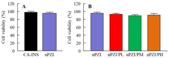 Corneal toxicity (A,B) in HCE-T cells treated with CA-INS, nPZI, nPZI/PL, nPZI/PM, or nPZI/PH. The compositions of the INS ophthalmic formulations are shown in Table 1. n = 8. Corneal toxicity was not observed for the nPZI and nPZI/P used in this study.