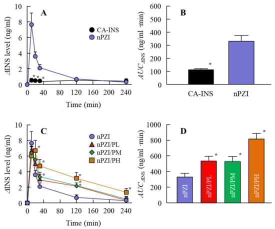 Changes in plasma INS (A,C) and AUCΔINS (B,D) levels in normal rabbits instilled with CA-INS, nPZI, nPZI/PL, nPZI/PM, or nPZI/PH. The compositions of the INS ophthalmic formulations are shown in Table 1. n = 6–8. * p < 0.05 vs. nPZI for each category. The ΔINS levels in rabbits instilled with nPZI were significantly higher than in rabbits instilled with CA-INS, and the ΔINS levels were enhanced by the addition of PAA in nPZI/P.