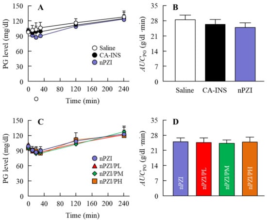 Next, we investigated changes in the plasma INS and PG levels following the instillation of ophthalmic INS formulations in normal rabbits (Figure 4 and Figure 5). The plasma INS levels in normal rabbits instilled with nPZI were significantly higher than in rabbits instilled with CA-INS (Figure 4A,B) and the AUCΔINS in the nPZI was higher in comparison with the CA-INS with 0.1% PAA (191 ± 23.5 ng/min·min, n = 4). However, while PG levels tended to decrease by the instillation of nPZI, the difference in the PG levels between normal rabbits instilled with CA-INS and nPZI was not significant (Figure 5A,B). We previously reported that particles approximately 150 nm in size are taken up into the eye by multiple energy-dependent endocytosis, resulting in increased ophthalmic absorption []. Therefore, our results support the previous study []. On the other hand, the enhanced plasma INS levels provided by nPZI were not enough to decrease PG, since the instillation of nPZI did not cause a rapid decrease PG under normal conditions. Therefore, a single instillation of nPZI may not cause hypoglycemia and be safe to use under normal conditions. Next, we investigated whether nPZI could prevent postprandial hyperglycemia in the rabbit model using OGTT (Figure 6). Although the AUCΔPG was similar in rabbits instilled with saline and CA-INS, the AUCΔPG for rabbits instilled with nPZI was 73.2% that in rabbits instilled with saline. Thus, nPZI may be effective in preventing postprandial hyperglycemia. Further work is needed to enhance the BA of INS delivered via the ocular route for practical use. Therefore, we also demonstrated the preventive effect of nPZI/P on postprandial hyperglycemia in the same rabbit OGTT model (Figure 6). The rise in PG in the rabbit OGTT model was further attenuated by the addition of PAA to the formulation. These results support the data for plasma INS levels in rabbits instilled with nPZI/P (Figure 4). The PG levels in normal rabbits tended to decrease in the 0–30 min time frame following the instillation of nPZI/P, although the difference between PG levels in rabbits instilled with nPZI/P and saline was not significant (Figure 5C,D). Such normalization of PG may be due to the regulation of INS secretion since PG levels are closely regulated in healthy individuals. In addition, it is known that the enhancement in the PG level that occurs postprandially seldom lasts beyond 3 h in normal patients due to the induction of INS (positive feedback). Taken together, we hypothesize that nPZI/P has no effect on PG levels in normal rabbits but can suppress the rapid changes in PG levels that occur in postprandial hyperglycemia.