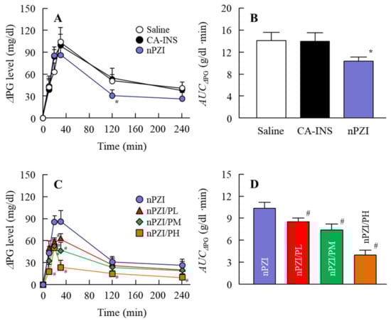 Changes in ΔPG (A,C) and AUCΔPG (B,D) levels in the rabbit OGTT (oral glucose tolerance test) model in rabbits instilled with CA-INS, nPZI, nPZI/PL, nPZI/PM, or nPZI/PH. The compositions of the INS ophthalmic formulations are shown in Table 1. n = 6–8. * p < 0.05 vs. Saline for each category. # p < 0.05 vs. nPZI for each category. The postprandial hyperglycemia in rabbits instilled with nPZI was significantly attenuated in comparison with rabbits instilled with CA-INS, and the preventive effect was enhanced by the PAA content in the nPZI/P.