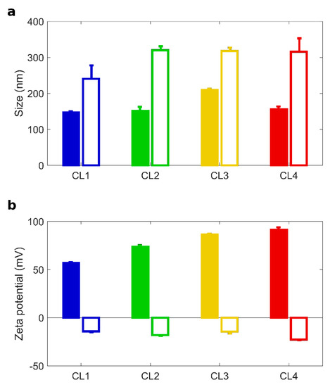 Size and zeta potential of TMZ-loaded CLs with and without BC. Size (a) and zeta-potential (b) of Temozolomide (TMZ)-loaded CLs (full histograms) and TMZ-loaded CL biomolecular corona complexes (empty histograms): CL1 (DOTAP/cholesterol), CL2 (DOTAP/DOPE), CL3 (DC Chol/DOPE), CL4 (DC-Chol/cholesterol).