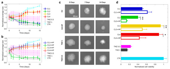 After 1 h incubation with HP, TMZ-CLs with BC were bigger in size than their counterparts (Figure 1a). The correspondent Polydispersity Indexes (PdI in Table 2) indicate that bare TMZ-CLs were homogenous in size, but TMZ-CLs with BC exhibited wider size distributions. These findings are most likely due to the formation of a thick protein layer at the particle surface leading to aggregation [41]. The inversion of the zeta potential is also caused by protein binding, as most plasma proteins exhibit negative charges at physiological pH. After preparation and chemical-physical characterization, TMZ-CLs with and without BC were diluted to have a final TMZ concentration of 0.5 mg/mL and administered to 3D spheroids [52]. Anticancer activity against GBM spheroids was evaluated by spheroids size distribution. Area of spheroids was monitored using digital microscopy to assess changes in spheroid size due to cell death and destruction of the spheroid architecture. Figure 2a reported the time course (from 0 to 14 days) of changes in tumor size, expressed as normalized average area, induced by the treatment with TMZ-loaded CLs, free TMZ at two different concentrations (0.5 and 1.0 mg/mL) and untreated spheroids as controls.