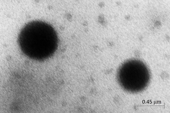 The morphology of the hydrated SLN dispersions was examined using transmission electron microscopy (TEM). In particular, a drop of SLN dispersion was applied to a carbon-coated copper grid and left for 1 min to allow some of the particles to adhere to the carbon substrate. The excess of dispersion was removed by adsorbing the drop with a piece of filter paper. A drop of 1% phosphotungstic acid solution was applied and, again, the excess of the solution was removed by adsorbing the liquid with the tip of a filter paper and the sample was air-dried. The sample was observed under a ZEISS EM 900 electron microscope (Oberkochen, Germany) at an accelerating voltage of 80 kV (Figure 1).