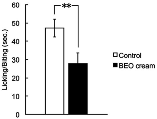Antinociceptive effect of topical application of NanoBEO (1 mg/mouse) on capsaicin-induced licking/biting behavior. The duration of licking/biting induced by capsaicin has been determined using the 5-min period starting immediately after the injection of capsaicin. Empty cream (1 mg/mouse) has been used as a control and this has failed to affect the capsaicin-induced nociceptive response. Values are expressed as mean ± SEM (n = 8). Values of p < 0.05 have been considered statistically significant. Improvement over control of 59.26%, ** p < 0.01.