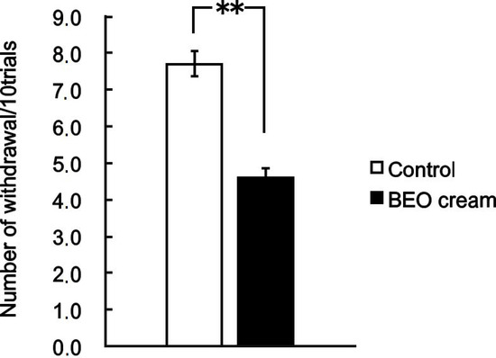 Antinociception was assessed using the capsaicin test as previously described [33,34]. To reduce variability, each mouse was acclimatized to an acrylic observation chamber (22.0 × 15.0 × 12.5 cm) for approximately 1 h before the injection of capsaicin. The mouse was injected with 20 μL of a solution of capsaicin (0.8 μg/paw) beneath the skin of the plantar surface of the right hind paw using a 50 μL Hamilton microsyringe with a 26-gauge needle as quickly as possible, with only minimal animal restraint. Following capsaicin injection, the animals were immediately placed in the test box for a 5-min observation period. Licking/biting behavior induced by the intraplantar injection of capsaicin was observed as an indicator of nociceptive response. NanoBEO (1 mg/mouse) and control (1 mg/mouse) was applied around the plantar surface of the right hind paw using a cotton swab 30 min prior to the capsaicin injection. The accumulated response time in seconds spent in licking/biting the capsaicin-injected hind paw was measured for a period of 5 min immediately after the subcutaneous (s.c.) injection of capsaicin.