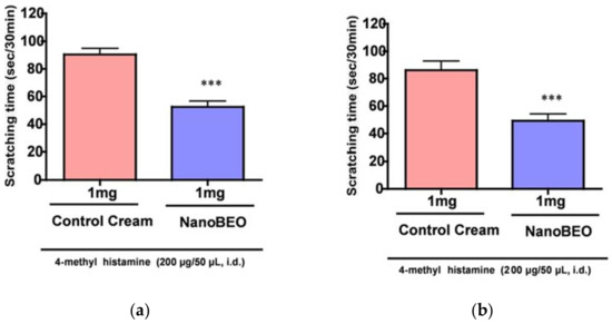 Anti-scratching effect of intradermal (i.d.) administration of NanoBEO on 4-methyl-histamine-induced behavior. The NanoBEO (1 mg/mouse) was used as pretreatment (30 min) (a) or immediately after (b) and has resulted as effective on the scratching behavior under both circumstances. The scratching time has been scored as seconds per 30 min. Empty cream (1 mg/mouse) has been used as a control and this has failed to affect itching. Values are expressed as mean ± SEM (n = 8). Values of p < 0.05 have been considered statistically significant. (a) Improvement over control of 53.13%, *** p < 0.001; (b) improvement over control of 56.67%, *** p < 0.001.
