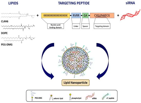 CL4H6, DOPE and PEG-DMG were prepared in 90% t-BuOH at a final volume of 400 μL, a molar ratio of 50:50:1 and a final total lipid concentration of 1.4 mg/mL. Then, 100 μL of a 0.4 mg/mL siRNA solution were mixed with the lipids to give an N/P ratio of 7.5. Next, the LNPs were prepared in 20 mM MES buffer (pH 6.0) as previously described []. A portion of the resulting LNPs were mixed with peptide cY at a weight ratio of 4:1 (peptide:siRNA) by rapid mixing to obtain the LNP+cY nanoparticles. The LNPs were stored at 4 °C until needed.
