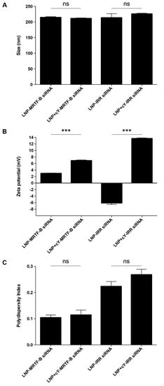LNP-MRTF-B siRNA and LNP+cY-MRTF-B siRNA with cleavable peptide Y were weakly cationic and had a mean charge of +2.9 ± 0.1 mV and +6.9 ± 0.2 mV (p = 0001), respectively (Figure 2B). On the other hand, LNP-IRR siRNA were weakly anionic and had a mean charge of −6.1 ± 0.5 mV, whereas LNP+cY-IRR siRNA with cleavable peptide Y were cationic with a mean charge of +13.6 ± 0.2 mV (p = 0.000004). Therefore, all nanocomplexes were near neutral [].