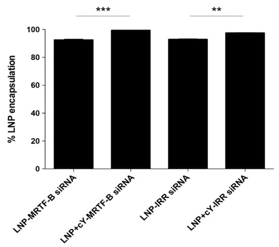 Percentage encapsulation efficiency of the LNP formulations: LNP-MRTF-B siRNA, LNP+cY-MRTF-B siRNA, LNP-IRR siRNA, LNP+cY-IRR siRNA. Results represent mean ± SEM for three independent replicates. **, p < 0.01; ***, p < 0.001.