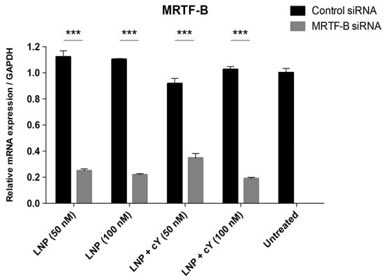 The LNP-MRTF-B siRNA concentration was 40 ng/μL and after performing the encapsulation assay, it was calculated as 37.0 ng/μL. The LNP+cY-MRTF-B siRNA concentration with cleavable peptide Y was 39.4 ng/μL and after performing the encapsulation assay, it was calculated as 39.1 ng/μL. The percentage LNP encapsulation significantly increased from 92.5 ± 0.7% for LNP-MRTF-B siRNA to 99.3 ± 0.1% for LNP+cY-MRTF-B siRNA (p = 0.0005) (Figure 4).