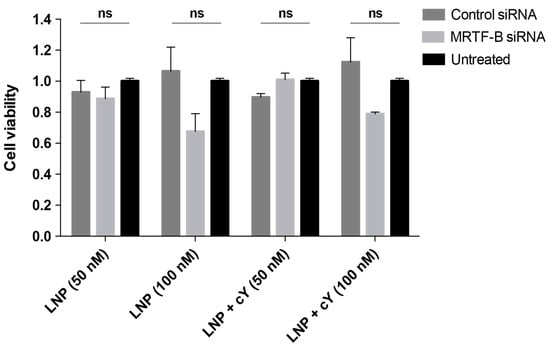 At a siRNA concentration of 100 nM, LNP-MRTF-B siRNA without cleavable peptide Y showed lower cell viability compared to LNP-IRR siRNA or untreated control cells, but the difference was not statistically significant (F(2,6) = 3.44, p = 0.10) (Figure 6). At a siRNA concentration of 100 nM, LNP+cY-MRTF-B siRNA with cleavable peptide Y treatment also led to decreased cell viability compared to LNP+cY-IRR siRNA or untreated control cells, but the results were not statistically significant (F(2,6) = 3.38, p = 0.10).