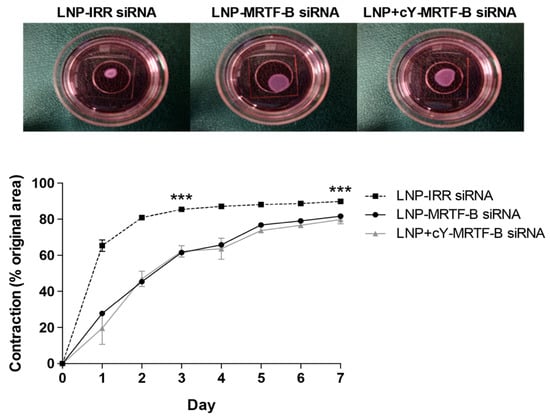 Three-dimensional fibroblast-populated collagen contraction assay of LNP-MRTF-B siRNA and LNP+cY-MRTF-B siRNA compared to LNP-IRR siRNA. All LNP formulations were tested at siRNA concentrations of 50 nM. Results represent mean ± SEM for three independent replicates. Representative gel areas at day 3 of contraction assay are shown. ***, p < 0.001.