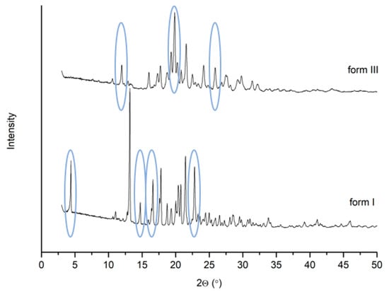 The analysis of the diffractograms of the two tested samples of sorafenib tosylate allowed for the identification of significant structural differences and to be able to classify them as polymorphic forms I and III [8,10,21] (Figure 1). The characteristic reflections for form I (4.4°, 14.8°, 16.7°, 22.9°) and for form III (12.0°, 19.9°, 25.9°) are marked.
