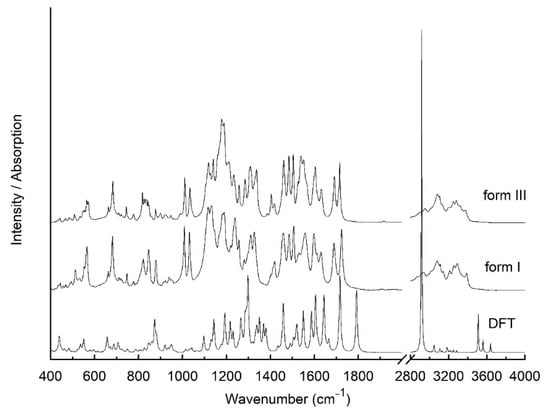 Calculation (DFT) and experimental IR absorption spectra of sorafenib tosylate form I and form III at room temperature.