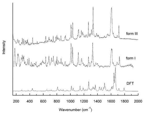 As a complementary to the XRPD differentiation of two polymorphs of sorafenib tosylate, we proposed FT-IR and Raman techniques (Figure 2 and Figure 3). Using theoretic calculations, we determined the theoretical spectrum of sorafenib tosylate—the reference spectrum. Based on the comparison with the reference spectrum, we described the characteristic bands; indicating the bands with changes allowed for samples to be distinguished from different polymorphic forms of sorafenib tosylate.