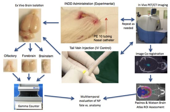 Intranasal drug delivery (INDD) workflow followed by positron emission tomography/computer tomography (PET/CT) imaging at 1 and 2 h. Each rat was placed into a customized induction chamber and anesthetized; and nanoparticles (NPs) were delivered intranasally for the experimental portion of the study or by IV via the tail vein for the control portion of the study. The rat was transferred into the PET/CT unit for imaging at various time points. The acquired images were used to manually define the three-dimensional (3D) regions of interest (ROIs). The intracranial intensity data from the PET and the corresponding CT scan were co-registered and imported into post-processing image analysis software for brain segmentation and subregion measurement. After imaging, the brain of the animal was isolated, and the brain subregions were dissected into the olfactory bulb, brainstem, and forebrain. The tissue was placed in a gamma counter for quantitative subregional assessment. Finally, the in vivo and ex vivo data were analyzed and compared for multi-temporal evaluation of the nanoparticles’ fate within the various anatomical regions of the brain.