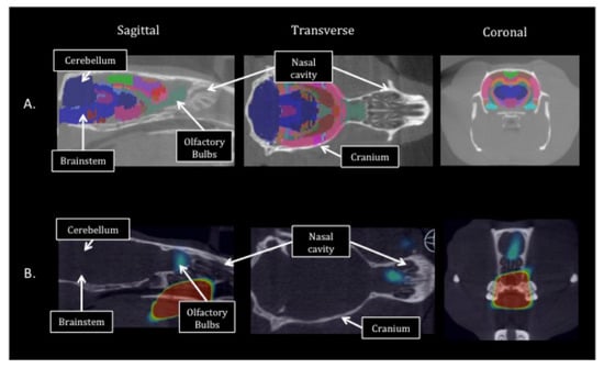The rats were anesthetized, followed by INDD or IV injection. For the INDD experiments, each rat was anesthetized with 4% isoflurane and placed in a supine position. Size PE10 flexible tubing was carefully inserted 2 cm deep into the right dorsal nasal cavity and attached to a syringe pump (Model 11, Harvard Biosciences, Inc. (Holliston, MA, USA) calibrated to deliver 30 µL/min. A total of 15 µL of PLA–PEG NPs was delivered over 30 s. A single rat was also administered 89Zr alone via the aerosolizer unit. IV controls were established using anesthetized rats maintained with mask inhalation. A tail vein was identified (Figure 1). A ½ cc tuberculin syringe with a 29-gauge needle containing 15 µL of the NP solution (100 µg PLA–PEG NPs with 100 µCi of 89Zr tagged to the surface) was injected into the tail vein. The animals were then transferred in the supine position into the PET/CT unit for image acquisition. The acquired images were transferred to a workstation for post-processing (Amira, FEI Co., Hillsboro, OH, USA) with a manual region of interest definition. The regions of interest were constructed in 3D by the investigators to exclude the PET signal from the extracranial structures. PET and CT were co-registered in 3D using the workstation software. This registration process was augmented using a digital version of the Paxinos and Watson rat brain atlas [15] that was scaled and registered to the PET/CT images. The rat brain atlas registration for brain subregion analysis was performed using commercially available software (VivoQuant 2.0, inviCRO LLC, Boston, MA, USA) (Figure 2). Standard uptake values (SUVs) were computed for the brain regions based on the electronic atlas regions of interest.