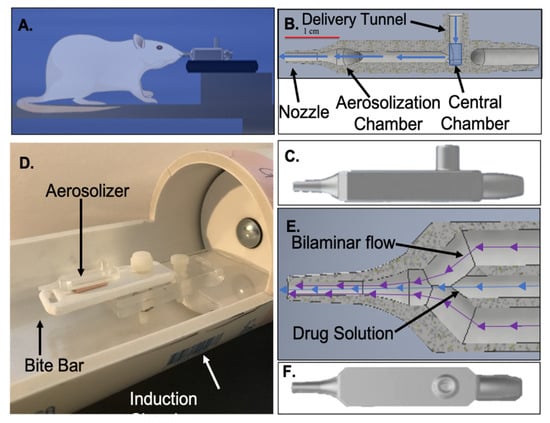 Intranasal aerosolizer set up. (A) Schematic of the aerosolizer relative to a cartoon of a rat. (B) Sagittal view of the internal component of the aerosolizer with a central chamber, delivery tunnel, aerosolization chamber, and nozzle in a manner very similar to Piazza et al., [16]. (C) Sagittal outer view of the aerosolizer. (D) Aerosolizer attached to the induction chamber tooth bar apparatus. (E) Top-down view of the internal component of the aerosolizer at the nozzle. The direction of the outer bilaminar flow of air (purple arrows) is shown, which then mixes with the central drug solution (blue arrows) to aerosolize the solution. (F) Top-down view of the outer aerosolizer.