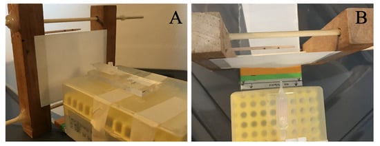 Aerosolized spray analysis. (A) Side-view and (B) top-view of the aerosolizer testing apparatus. The first edge of green tape represents 5 mm from the aerosolizer tip, and the first edge of orange tape represents 11 mm from the aerosolizer tip. The white paper was coated in petroleum jelly so that droplets could be seen. The toothpick at the top of the paper was marked at a known 1 cm for use later in image analysis.