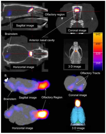 - Veronesi, M.C.; Alhamami, M.; Miedema, S.B.; Yun, Y.; Ruiz-Cardozo, M.; Vannier, M.W. Imaging of intranasal drug delivery to the brain. Am. J. Nucl. Med. Mol. Imaging 2020, 10, 1–31. [Google Scholar] [PubMed]