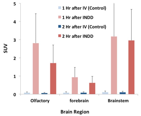 Brain region activity at 1 and 2 h following INDD of 100 nm PLA–polyethylene glycol (PEG)–89Zr NPs as detected by PET/CT in vivo. The standard uptake values (SUVs) were calculated using the Vivoquant ROI Paxinos and Watson Brain atlas plug-in to determine the differential activity in various regions throughout the brain. In particular, the signal activity was highest in the olfactory region and brainstem following INDD of the PLA–PEG–89Zr NPs. Relatively less activity was seen in the forebrain.