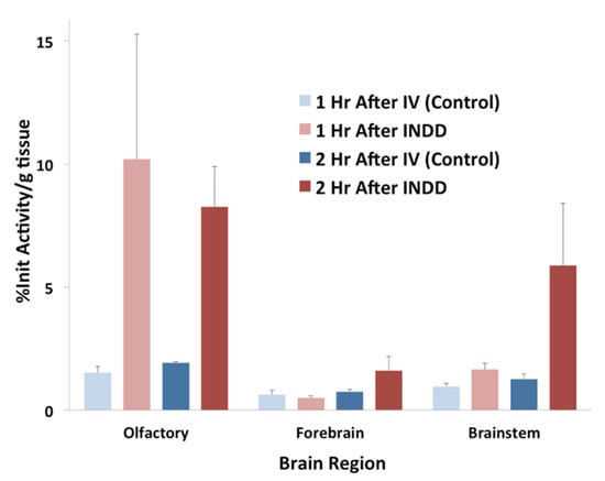 Interestingly, we observed greater activity in the brain stem relative to the olfactory region using PET at both time points (Figure 7). This pattern was reversed in the gamma counter studies, where the signal in the olfactory bulbs was higher than that in the brain stem at 1 and 2 h post-treatment (Figure 8). We believe this may reflect the importance of distributing the nanoparticles uniformly in the dorsal superior nasal cavity, which we propose would be an added benefit of aerosolized intranasal delivery over liquid solution delivery through nasal tubing. This finding also points to the importance of understanding and optimizing the adhesion of drugs or NPs within the nasal cavity, which in turn increases retention and absorption [23]. This variability in uptake of the olfactory bulb relative to the brain stem was also demonstrated in the autoradiography study (Figure 6), where one rat had greater uptake in the nasal cavity, and the other had stronger uptake in the brainstem.