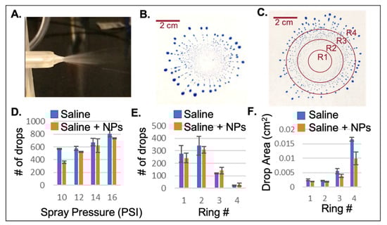 The spray characteristics were measured based on a time lapse video (Figure 9A), and by collection of aerosolized blue dye onto a filter paper (Figure 9B). The optimal pressure applied for maximizing the percent sprayed from the drug chamber was determined to be 12 PSI (Figure 9D), beyond which higher PSI applications did not result in a greater percentage of drug solution administered. Consistently, 90% of the solution administered to the central chamber was removed from the chamber during aerosolization. The plume characteristics revealed maximum aerosolization centrally within rings 1 and 2 (Figure 9C,E), with a small average size per drop in the central two rings, which had the greatest chance of reaching the olfactory epithelium (Figure 9F). Larger droplets were considered less ideal because of their potential for faster clearance from the nasal cavity. The countable droplets were minimized to 10–12 PSI.