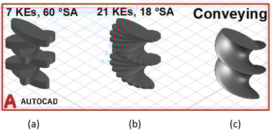 where R is the outer radius of the kneading element, is the number of kneading elements in the kneading block for the screw configuration, is the thickness of each kneading element and is the stagger angle between the kneading elements for the configuration. Based on the finite element approximation of the conveying screw as described in Section 3.1, the expression for the available volume for the conveying section has been given in Equation (3):