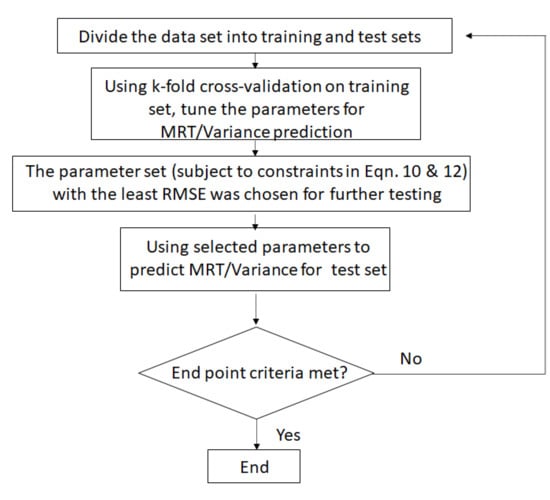 Figure 3 shows the schematic of the algorithm developed for predicting MRT and variance. The general idea for the algorithm goes through the following steps. Initially, the experimental dataset goes through a splitting step. After the split, the larger subset (i.e., training set) is used to train the model for MRT and Peclet number (and in turn the variance) while ensuring the constraints described in Equations (10) and (12) in Section 3.2. Training is based on the developed Equations (9) and (11) as described in Section 3.2. For parameter optimization the ’fmincon’ function in MATLAB was used, the parameters resulting in predictions having the least root mean square error (RMSE) were chosen to further predict the MRT and variance for the initially divided smaller subset (test set). If the predictions on the smaller subset meet certain end point criteria, then the model is stopped. If not, the process is started again.