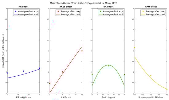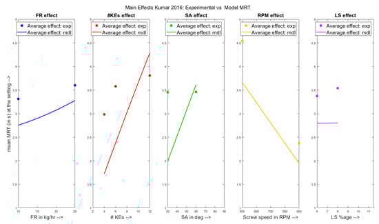 The individual main effects of the varied parameters, powder feed rate (FR), number of kneading elements (# KEs) in the configuration, stagger angle between the kneading elements (SA) and the rotational speed of the shafts of the extruder (RPM) have been shown on the experimental MRT and on the model predicted MRT in Figure 4 for the Kumar et al. 2015 dataset. From the figures, it can be seen that the MRT of the TSG showed an increasing trend with respect to the increasing powder feed rate range from 10 kg/h to 25 kg/h and number of kneading elements from 2 to 12. On the other hand, the MRT decreased with respect to increasing screw speed from to . These observations are in line with the equations formulated in Section 3.2. However, it can be seen that the average MRT increased and then subsequently decreased as the stagger angle was increased from first 30 to 60 and then 90. Additionally, it was reported by Kumar et al. 2015 [21], that several experimental data points were missing for run cases of 90 SA due to the jamming of the equipment. This lack of comparable data points is the reason for a low average MRT value at high stagger angle.