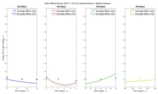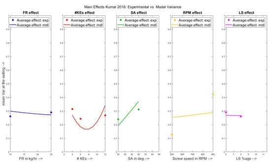The main effects of the parameters have been shown on the experimental variance the model predicted MRT in Figure 7 respectively for the Kumar et al. 2016 dataset. From the figures, it can be seen that the model predicted a decreasing variance with increasing feed rate as was previously for the Kumar et al. 2015 dataset but the experimental trends showed a contradictory increasing trend. Another observation is that the experimental average variance increased on increasing the number of kneading elements in the screw configuration from 6 to 12.