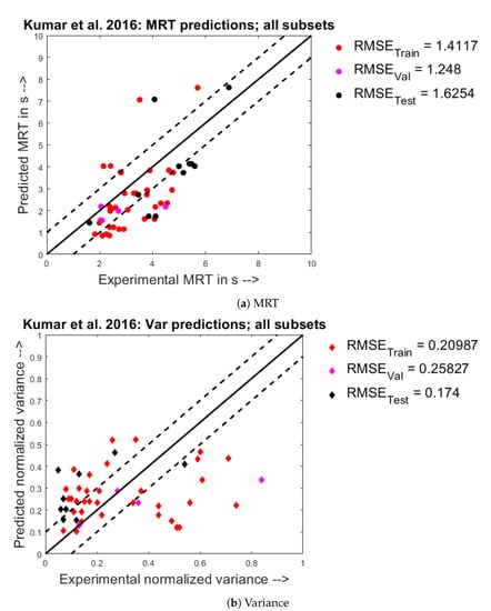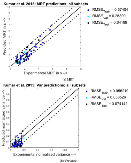 The parity plot for the experimental values of the MRT (X) vs. the predicted MRT values (Y) for the Kumar et al. 2015 dataset has been given below in Figure 8a. From the scatter points chart, it is seen that the most of the points were within the chosen confidence intervals of +/− 1 s. Moreover, it can be observed that most of the points are spread evenly on either side of the line. Similarly, from the parity plot for normalized variance for the Kumar et al. 2015 dataset in Figure 8b, it is seen that the most of the points were within the chosen confidence intervals of +/− 0.1, and most of the points are spread evenly on either side of the line. The confidence intervals were chosen in accordance with the variation of the points for the experimental dataset.