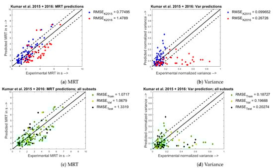 The parity plots between experimental values and model predictions obtained by combining the two datasets, Kumar et al. 2015 and Kumar et al. 2016 are seen below in Figure 10. It is to be noted that the number of data-points from each individual dataset were in the same proportion in the total combined dataset and the partitioned datasets (Training, Validation & Test). Comparing the corresponding results for MRT and normalized variance, it is seen that the predictions built using a combined dataset are worse when compared to the predictions built using a single experimental dataset. It is seen that for the Kumar et al. 2015 dataset, the prediction using a jumbled training set is 0.77 s, and the for the Kumar et al. 2016 dataset is 1.48 s. Similarly, for the normalized variance results, the for the Kumar et al. 2015 dataset trained using a combined training dataset is , and the for the Kumar et al. 2016 dataset is . At this juncture, it must be noted that the LS% ages were 11.5% for the Kumar et al. 2015 dataset and the LS% ages were varied from 6 to for the Kumar et al. 2016 dataset. One plausible reason for the poor prediction using the combined Training set may be that the main effects of FR have been contrary for the Kumar et al. 2015 and Kumar et al. 2016 experimental datasets respectively as seen in Section 4.1. Additionally, from the parity plots in Figure 10c,d, it is seen that the properly predicted, under- and over-predicted points were distributed in equal proportion across the training, validation and test datasets. This gives further indication to the veracity of the modelling approach.