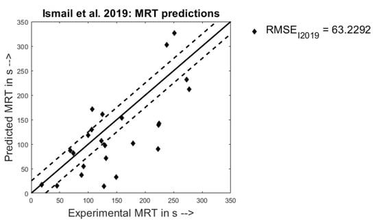 From Figure 11, it is seen that the model predicts the experimental values of the MRT for the Ismail et al. 2019 dataset in the right scale for quite a lot of the points, with many points +/− 20 s from their experimental value. However, there are quite a few points in the experimental values range of 125–225 s that have been under-predicted, thereby, leading to a large value of 63.23 s. It is to be noted here that the confidence interval for this dataset was higher compared to the previous datasets in order to account for the higher MRT values reported by Ismail et al. [14].