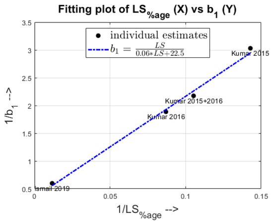From Figure 12, it can be seen that the scaling constant for MRT fits with respect to varying liquid-to-solid percentages in a Langmuir-like trend. The reciprocal of the fitted parameter values, for each dataset was plotted against the respective reciprocal of the number-averaged LS percentage (Kumar et al. 2015- 7, Kumar et al. 2015 + 2016- , Kumar et al. 2016- and Ismail et al. 2019- ). From this trend we infer that as the liquid content in a TSG operation increases, the granulation rates would increase, thereby leading to greater quantities of larger granules in the system which would lead the particles to have a slower net average velocity giving a higher macroscopic MRT value. However, increasing the LS percentage beyond a limit would yield diminishing returns as the greater liquid quantities might just dissolve the excess powder particles and exit the system.