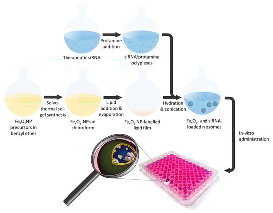 Among nanocarriers, niosomes (non-ionic surfactant vesicles) exhibit great properties to facilitate siRNA delivery [46]. Niosomes show low toxicity and high biocompatibility within biological systems. Moreover, their low cost, simple preparation and remarkable stability make them a notable candidate for potential commercialization. In order to achieve specific functionalities, the hydrophilic core and the hydrophobic bilayer structure can incorporate various low-molecular substances, proteins, DNA/RNA and nanoparticles with a wide range of solubilities [47,48]. If entities with strong magnetic properties (e.g., superparamagnetic iron oxide nanoparticles, referred to as FexOy-NPs) are entrapped, an external magnetic field can be used to achieve a magnetic targeting functionality of the resulting hybrid niosomes [49,50]. Thus, the superparamagnetic structures can be guided to and accumulate at the intended target tissue which consequently lowers concentrations in off-target sites and, hence, significantly improves the therapeutic outcome [51,52,53,54].
