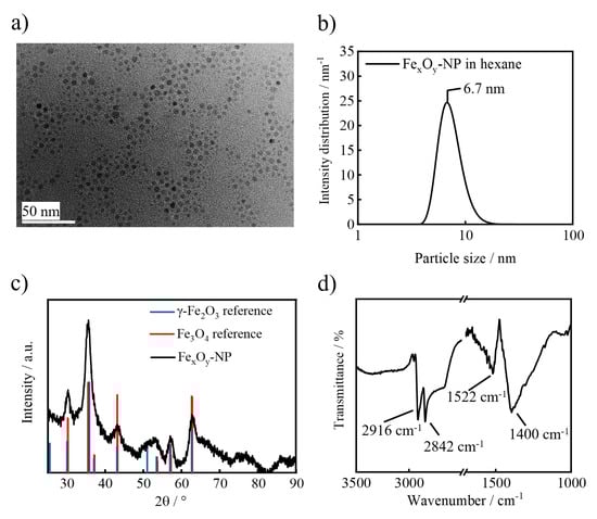 Since the cubic structure and the lattice parameters of magnetite and maghemite are quite similar, a more accurate determination of the iron oxide composition is not possible via XRD. Applying the Debye–Scherrer equation to the highest intensity reflection at 36.6° with an FWHM (full width at half maximum) of 1.5° and Ks (dimensionless shape factor for spherical particles) of 0.9 leads to a crystallite size of 5.8 nm, which is in good agreement with the particle sizes obtained by TEM and DLS. Furthermore, the FT-IR spectrum of the FexOy-NPs shows alkyl group-based peaks at 2916 and 2842 (symmetric and asymmetric CH2 stretching modes), 1522 and 1400 cm−1 (NH2 scissoring mode as well as asymmetric and symmetric COO– stretching) which confirm the presence of hydrophobic stabilizing agents on the FexOy-NP surface (Figure 2d) [63,64].